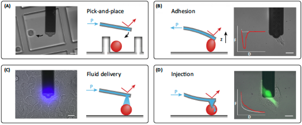 - Garza, H.; Stoute, R.; Ghatkesar, M.; Staufer, U. Self-sensing nanopipette for liquid dispensing and AFM imaging. In Proceedings of the 2013 Transducers & Eurosensors XXVII: The 17th International Conference on Solid-State Sensors, Actuators and Microsystems, Madrid, Spain, 16–20 June 2013; pp. 2648–2651.
