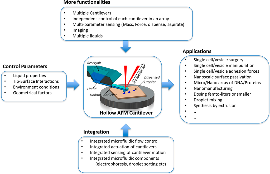 The evolution of various AFM cantilever based fluid manipulations system are classified in Table 1 and subsequently discussed. It started by simple dipping and writing technique called Dip Pen Nanolithography (DPN) technique using commercially available AFM probes. To increase the reproducibility and on-chip liquid storage capability, Nanoscale Dispensing (NADIS), Nanofountain Probe (NFProbe) and Scanning Ion Pipette (SIP) devices were developed. A variety of experiments like dispensing biomolecules, inorganic substances and even manipulation of single cell were performed to prove their capabilities [19,20,21]. The challenges arise in simultaneously controlling multiple parameters (mentioned above) affecting the dispensing process.