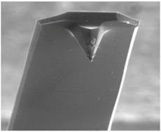 Without using any microfabrication techniques, glass can be pulled to make fine glass capillaries that can be used to dispense/aspirate liquids (Table 2, item a). Glass capillary with an outer diameter of 10 nm and a nozzle of 3 nm was shaped into a L-type cantilever, with 12 microns of short-length and 300 microns of long-length. With gold coating on the capillary, the cantilevered NFPen was used as a regular AFM probe. They have resonance frequencies of several hundred kilo-hertz and force constants of tens of N/m to tenths of N/m. Fountain pen nanochemistry was first demonstrated by etching a 16 μm long, 1.5 μm wide, and 200 nm deep trench in a chrome layer within 40 s at room temperature [26]. Electrophoretic protein printing [70], printing of protein array [71,72], deposition of single walled carbon nanotube [73], polymer lenses [74], molecularly imprinted microstructures [75,76] were also demonstrated using this technique. One of the challenges of this technique is the reproducibility in making the pens and their arrays for high throughput applications.