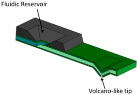 | (c) Nanofountain Probe (NFProbe) [23] | ![]() | A continuous supply of ink to the tip is achieved by on-chip reservoir and a capillary connection between them. Liquid is dispensed through a volcano-like tip. |
