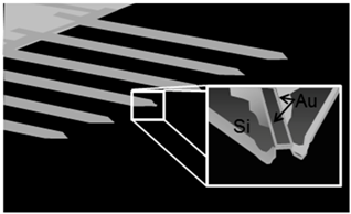 The fabrication of the Bioplume was based on standard micromachining techniques. The process begins with an n-type silicon-on-insulator (SOI) wafer, with a 1 μm thick buried oxide layer and a 50 μm thick top silicon layer. The first step consisted in creating the piezoresistor in the bulk silicon (Figure 3, Column 2a). In order to optimize its sensitivity, the cantilever was patterned along the crystal axes, for which the longitudinal coefficient is maximum, i.e., along the (1,1,0) direction in the case of a p-silicon piezoresistor. The localization of the piezoresistive layer at the anchored edge of the cantilevers was accomplished by using SiO2 as a masking layer. Therefore, 300 nm of SiO2 was thermally grown and patterned with a photolithographic step. After removing the oxide masking layer in BHF, the cantilever shape was created by deep reactive ion etching (DRIE) of the top Si layer (Figure 3, Column 2b). The final shape of the piezoresistor was achieved with this anisotropic dry-etch process. The channel and the reservoir were also fabricated during this step. A 200 nm thick plasma-enhanced chemical vapor deposition (PECVD) oxide layer was deposited to protect the piezoresistors and to electrically insulate the bulk silicon from the metal lines to be patterned. Contact holes were opened, and a 200 nm-thick AlSi layer was sputtered and patterned in order to obtain electrical contacts for the resistors (Figure 3, Column 2c). After the shape of the cantilever was delineated, the electrodes required inside the channel for the electro-assisted methods were fabricated (Figure 3, Column 2d). The connecting metal lines and bonding pads were fabricated along with the metallic electrodes by metal lift-off technique. Finally, the cantilevers were released by DRIE-etching the backside of the silicon wafer, followed by RIE of the buried SiO2 layer (Figure 3, Column 2e).