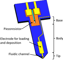 Bioplume is a cantilever-based dispensing device with integrated piezoresistors. The design of the device was inspired by geometrical features located on the nib of a fountain pen (Table 2, item c). It has a reservoir and a long open split channel at the tip for fluid flow from reservoir to the substrate. The channel in the center of the cantilever with an electrode embedded is used as a path for fluid flow from the reservoir to the dispensing tip. The electrode allowed electrowetting and electrochemistry of the liquid inside the channel. This was achieved by applying an electric potential between the fluids and the substrate. The electrode was slightly receded inwards near the cantilever tip to avoid its direct contact with the substrate. The length, width, and thickness of the beam were 1500, 120, and 5 μm respectively; the length and width of the fluid channel were 200 and 4 μm respectively; the length and width of the reservoir were 200 and 24 μm, respectively. The cantilever had a spring constant of 103 N/m. The droplets were deposited by simply touching the substrate. The size of the droplet was dependent on the time of contact and the wetting properties. Typically, droplet diameters ranging from 1 to 100 μm at the rate of about 10 drops/s were deposited. The self-sensing piezoresistors were made out of p-doped silicon with a resistivity of 4.1 × 10−3 ohm-cm and a resistance of 5.7 kiloohms [29,88,89]. With an applied voltage range of 0 to 210 V, droplets of 5 to 40 μm diameters with volumes 20 fL to 14 pL were deposited [90]. The deposition of polymers, biological solutions, and metal particles were also demonstrated [91,92]. The aspiration of liquid by electrowetting was possible with this device [93].