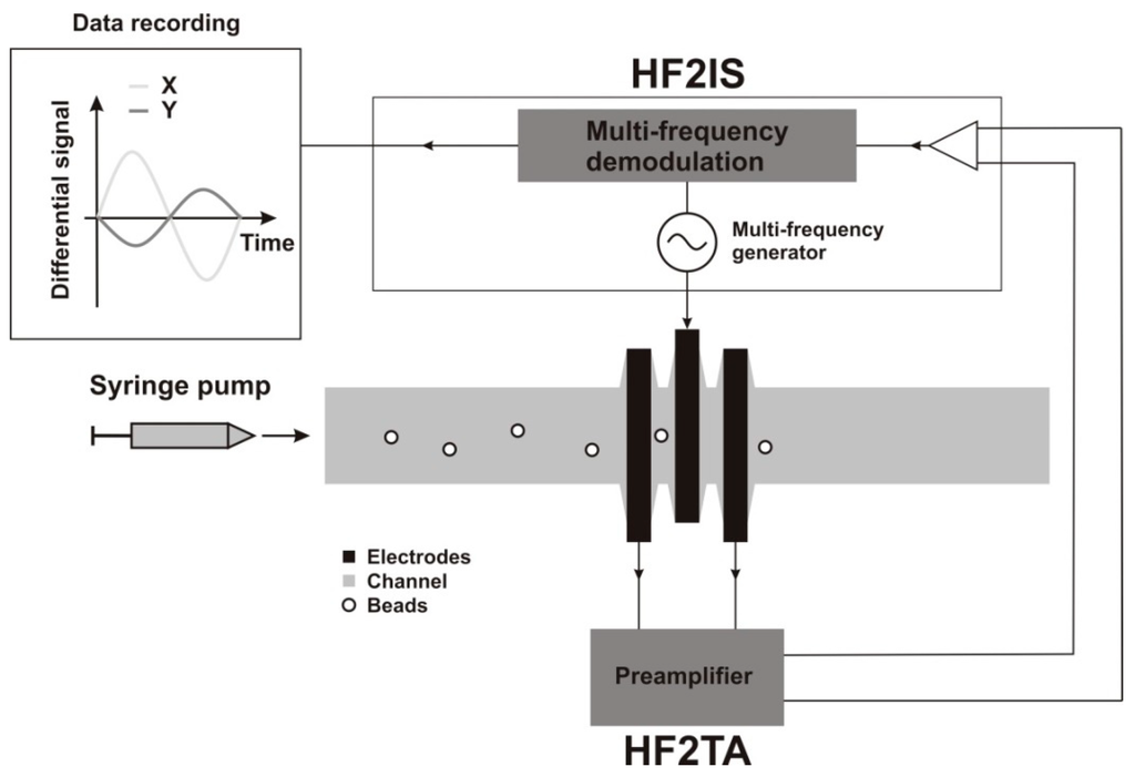 Schematic representation of the system. A syringe pump injects the sample into the system. The signal is generated by a multi-frequency lock-in amplifier, which also detects the signal. A current preamplifier (HF2TA, Zurich Instruments) is used to amplify the signal from the measuring electrodes before it is returned to the HF2IS Impedance Spectroscope (Zurich Instruments). A differential signal between the two measuring electrodes is recorded on a computer for further analysis by MATLAB.