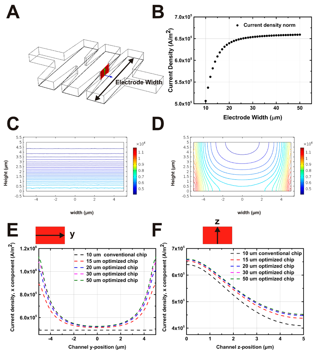 FEM simulation of the current density. (A) 3D sketch of the channel with wide electrodes. The current density was evaluated through the detection cross-section (red surface) between the electrodes using FEM. (B) Normalized current density through the detection cross-section as a function of electrode length the optimized chip. (C) Contour plot of the current density in the detection cross-section for the conventional electrode layout. (D) Contour plot of the current density in the detection cross-section for the improved electrode layout. (E) Line plot of the x-component of the current density for z = 2.5 μm as a function of the y-coordinate across the detection cross section for varying electrode widths. (F) Line plot of the x-component of the current density for y = 0 μm as a function of the z-coordinate across the detection cross-section for varying electrode widths.