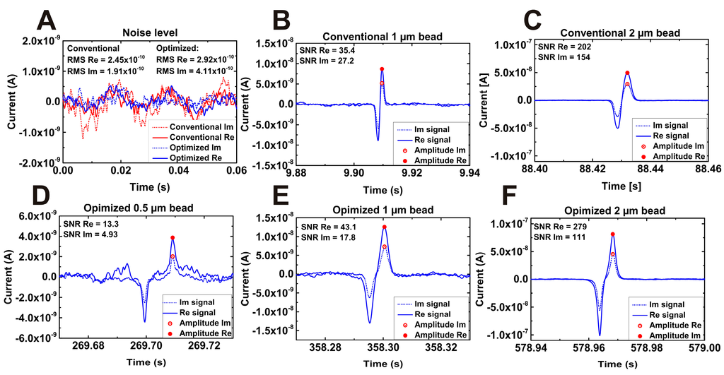 Figure 5A shows the time dependant noise level of the two different electrode layouts. The root mean square of the noise from the different signals are with an n value of 2000, conventional real = 2.4585 × 10−10 A, conventional imaginary = 1.90681 × 10−10 A, optimized real = 2.9216 × 10−10 A, and optimized imaginary = 4.1071 × 10−10 A. Figure 5B–F show single transitions of the different detected particles for the two systems. It is seen that the shape of the time dependant transition is slightly elongated and more defined in the optimized chip design due to the different geometrical layout of the channel and electrodes. This is due to the lower flow velocity in the enlarged regions of the channel and the concentrated electric field in the constricted area between the electrodes, respectively.