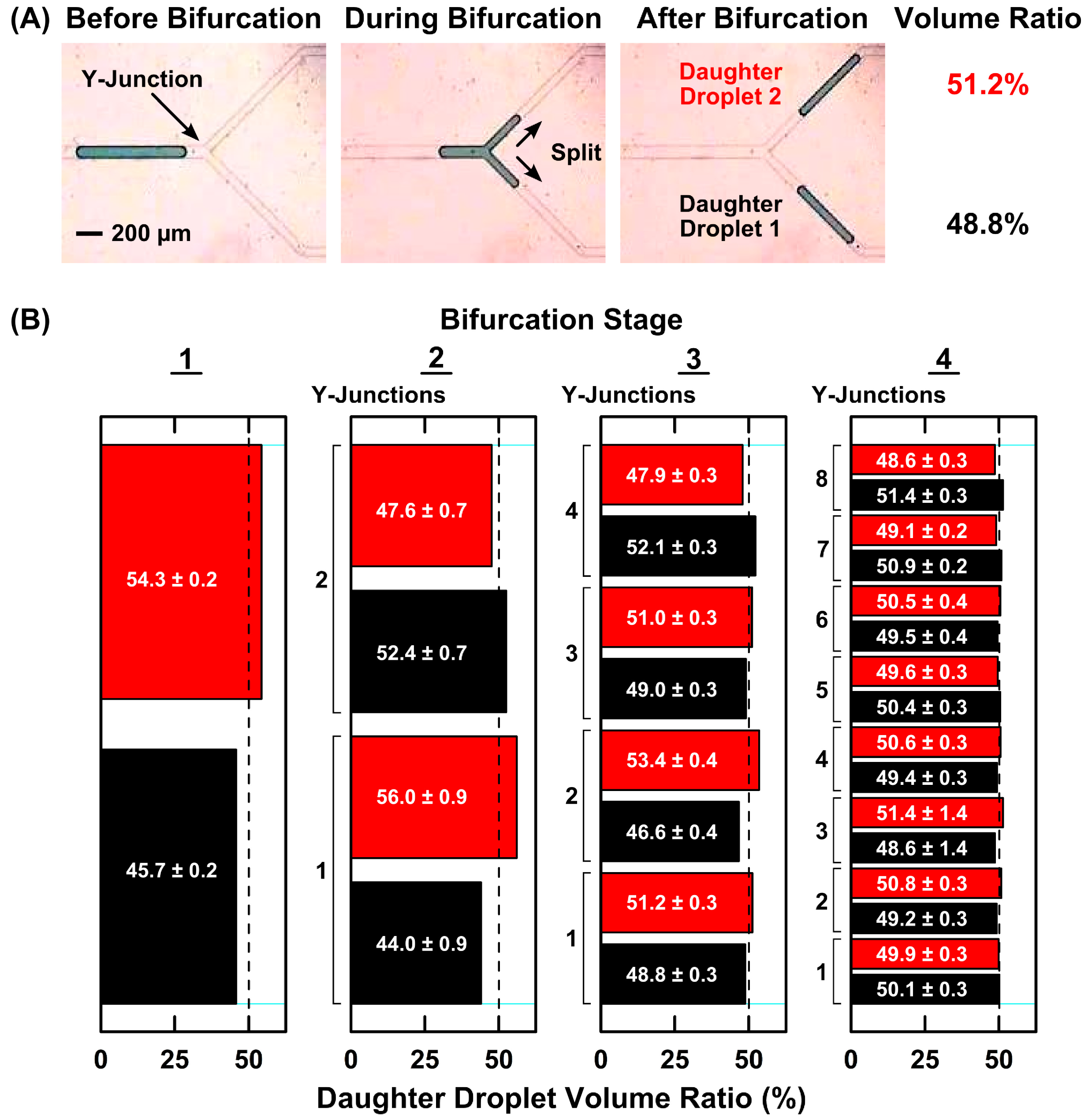To quantitatively analyze the bifurcation performance across the four bifurcation stages, we used image analysis software to determine the volume of the pair of split droplets after splitting at each of the 15 Y-junctions and calculated the ratio of the volume of each droplet over the combined volume. As such, a volume ratio of 50% for both daughter droplets indicates even droplet splitting. In our devices, we had measured ~50% volume ratio of daughter droplets at the four different stages and the 15 Y-junctions (