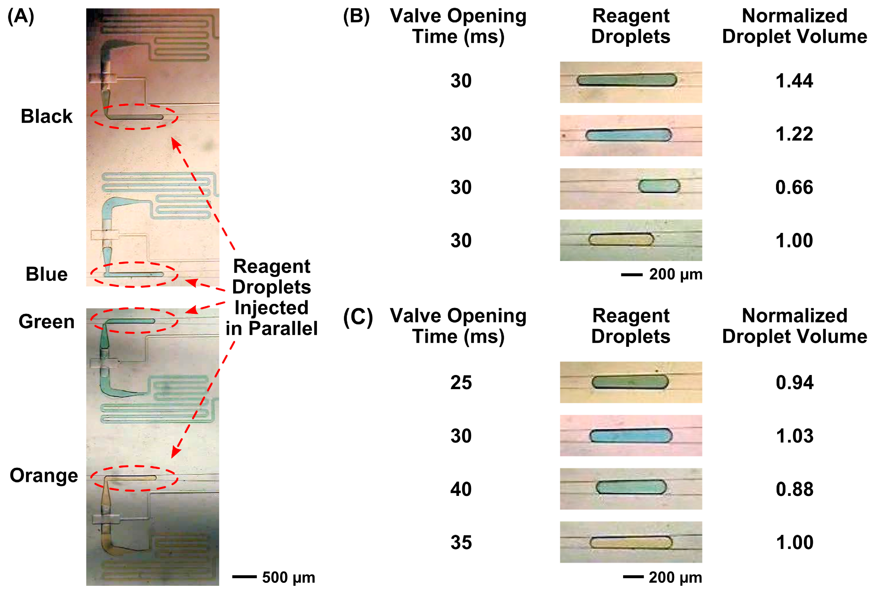 Importantly, the individually controlled reagent inlets in our device allow us to calibrate each inlet independently and to ensure consistent and accurate volume injection across parallel reagent channels. For example, when we loaded four different colors of food dye (orange, green, blue, and black) as the reagents and programmed the four reagent microvalves to open with an identical opening time (e.g., 30 ms), the four resulting droplets differed by as much as 44% in normalized droplet volume (