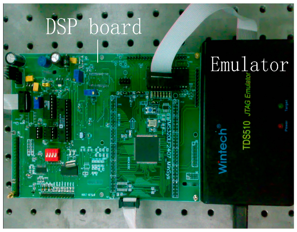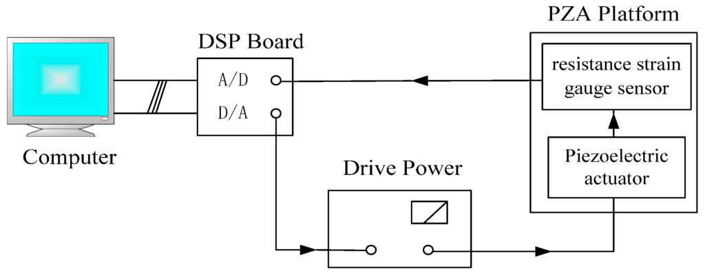 The similarities among hysteresis trajectories are investigated through a set of experimental tests on a piezoelectric actuator-based micro/nano-meter movement platform system as depicted in Figure 1. A digital signal processor (DSP, TMS320LF2407, Texas Instruments, Houston, TX, USA) system is employed to implement controller as shown in Figure 2. The D/A (16-bit AD669, Analog Devices, Norwood, MA, USA) board produces an analogy voltage output which is then amplified by drive power (HPV series) to provide a voltage for driving PZA (MPT-1JRL/I002, Physik Instrumente, Shanghai, China). The output voltages of the power amplifier range from 0 to 150 V, and the resolution is 5 mV. Output displacements of PZA are measured by a resistance strain gauge sensor which is installed within the platform as a micrometer and then are converted into digital signals by A/D (16-bit AD976, Analog Devices, Norwood, MA, USA) board. A serial port is used to pass the data from the DSP to the computer. The devices are shown in Figure 3. The withstand-voltage range of PZA is −30–120 V. The input voltages of the PZA are limited to the range of 0–100 V, considering the safety margin and the driving ability of the power amplifier.