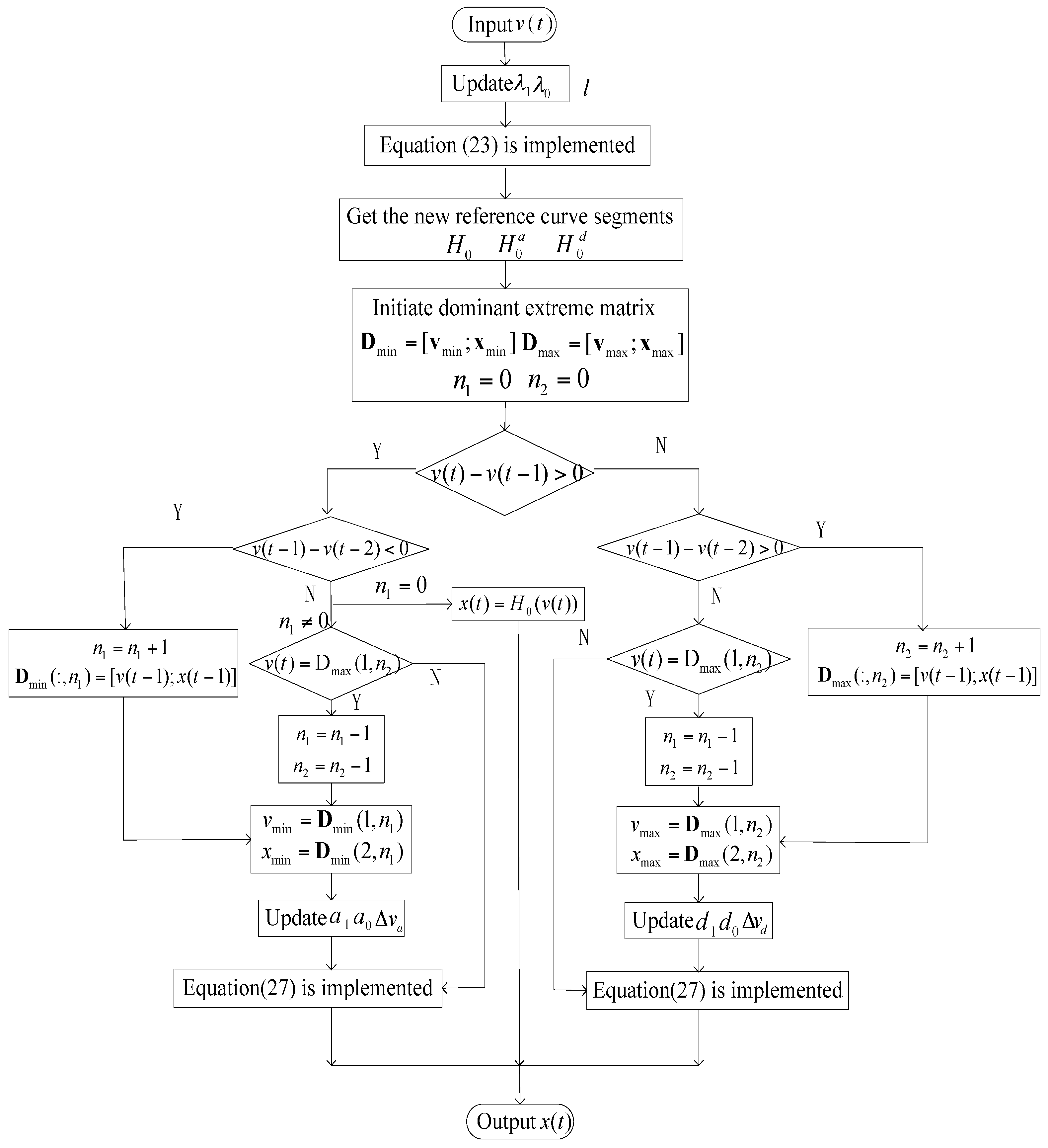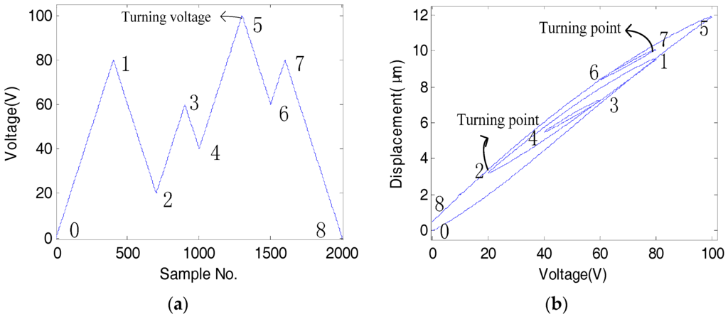 As demonstrated in [16,17], the wiping-out effect is another important inherent property of hysteresis in PZAs. If the input voltage value is larger than some history maximums or lower than some history minimums which have yet to be wiped out, these hysteresis extremes are wiped out and the output trajectory associated with these maximums are wiped out and will no longer affect the following output response. The wiped out turning points are no longer affect the future hysteresis responses. For instance, when the input voltage moves on the ascending curve from point 4 to 5 and passes the point with the same magnitude as the extreme point 3 in Figure 5a, turning points with turning points 3 and 4 in Figure 5b are wiped out and the minor loop associated with turning points 3 and 4 is no longer useful for the remaining hysteresis. Similarly, turning points 2 and 1 are wiped out when the input voltage continues to increase to point 5, while turning points 6 and 7 are wiped out when the input voltage moves downward from point 6 to 8. Once the wiping out occurs, the hysteresis trajectory follows the path of the previously broken curve. This property is called curve alignment [17]. In Figure 5b, the hysteresis curve segment 4–3 is associated with turning point 4. Point 4 is called the dominant extreme for curve 4–3. After wiping out of points 3 and 4, trajectory 3–1 slightly bends and aligns to previous broken curve 2–3 that departs from turning point 2. At this time, point 2 is the dominant extreme for curve 3–1. Likewise, the dominant extremes of curve segments 1–5 and 6–8 are extremes 0 and 5, respectively. We conclude that if the direction of input changes before hitting a turning point, the dominant extreme will be different from that after hitting the turning point.