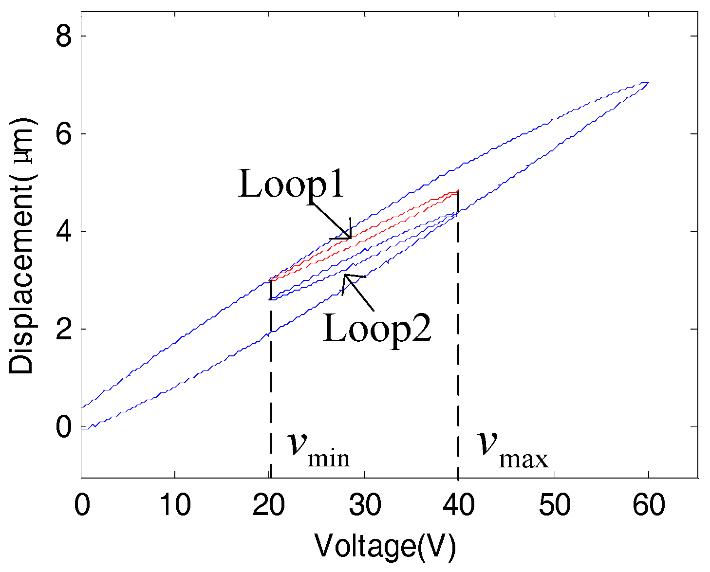 When implementing the proposed model, only the reference voltage sequence and the reference displacement sequence first need to be stored. While using the Preisach model, a limiting triangle database of the first-order reversal curve elongation, which is difficult to realize and record, needs to be stored in advance through experiments. Storing the database of the reference sequences is much easier than the one for first-order reversal curve elongation. When implementing the proposed model, the current displacement is obtained by only calculating several polynomials, which disclose the rules of hysteresis trajectories and take less computation time. However, the displacement in the Preisach model is obtained by calculating the summation of the weighted effective areas in the limiting triangle database, which is much more complex [18].