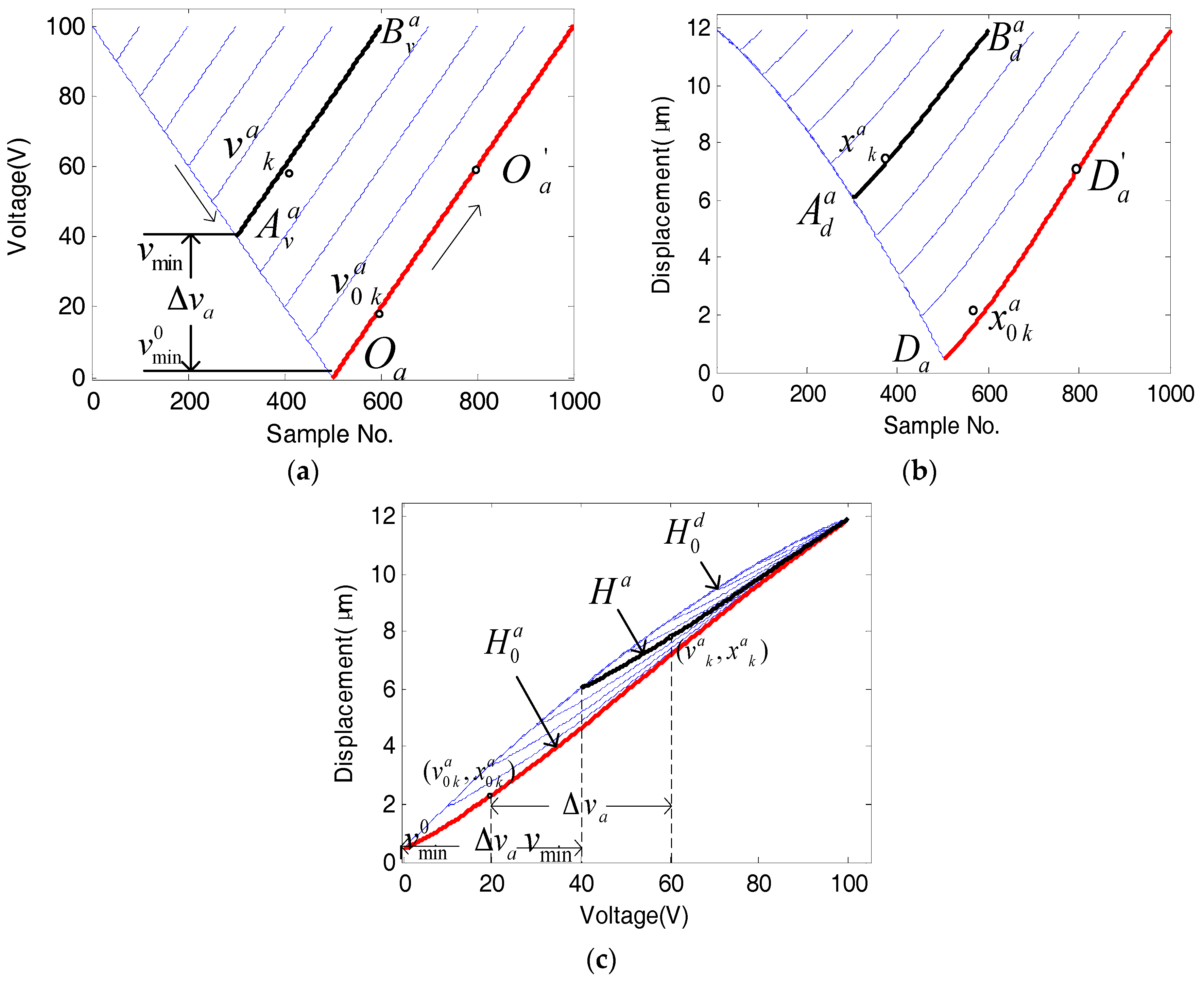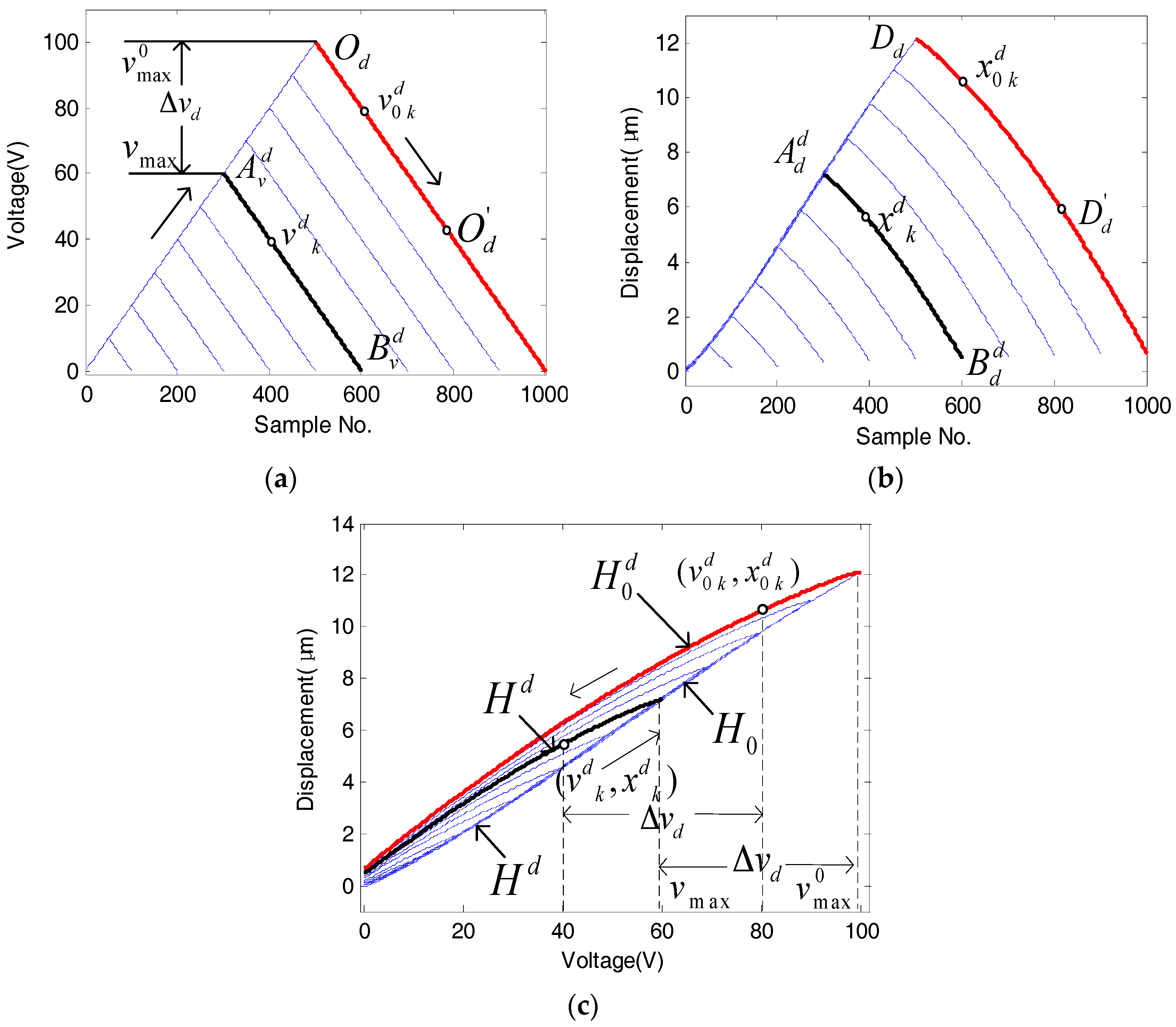 First, we raise the input voltage from initial state (0 V) to its maximum value and then decreasing it to zero. Figure 7a shows 10 sets of driving input signals with the same minimum voltages (0 V) but different maximum voltages. Figure 7b shows the corresponding output displacements of PZA. The displacement responses versus the input excitations are shown in Figure 7c. As seen from Figure 7b,c, all ascending curves departing from initial state have an identical path, and all the descending curves branching from different positions have a similar shape. Therefore, what we study is the similarity of these descending curve segments.