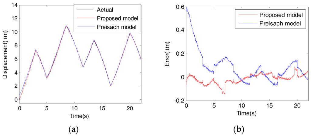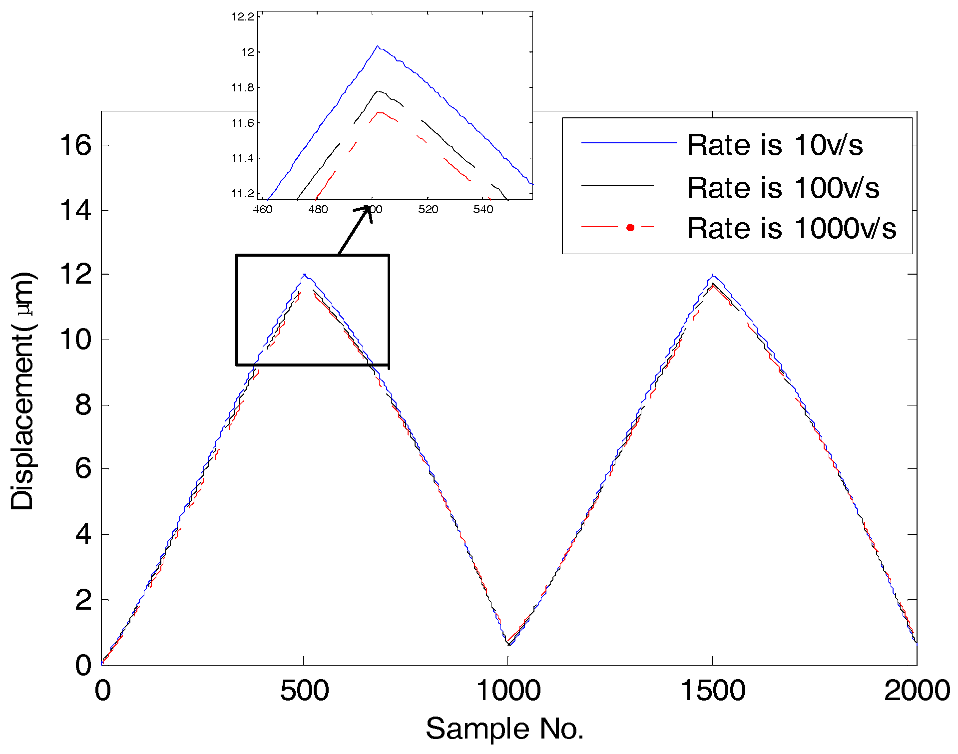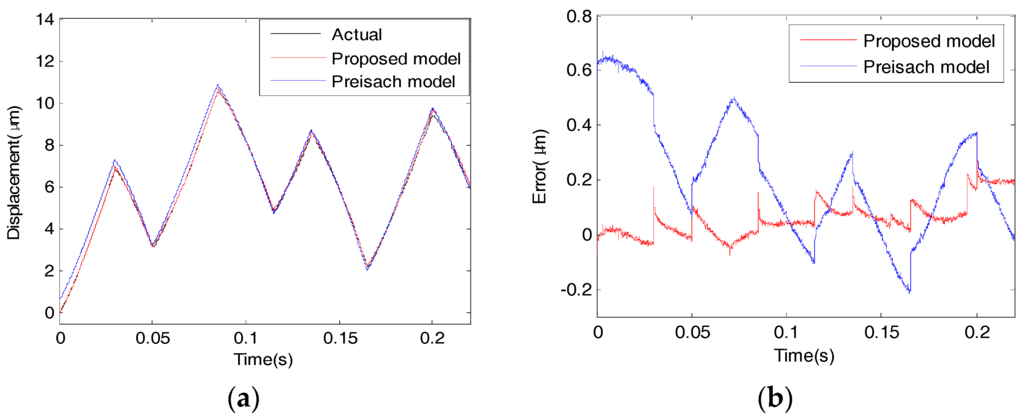 Figure 18 and Figure 19 show the modeling performances of the proposed model and the Preisach model under the triangular input excitation (Figure 17a) at low rate and high rate, respectively. Table 7 gives the specific data of mean absolute errors (MAE) and root mean square error (RMSE). It is observed that when triangular input excitation with a low rate (20 V/s) is applied, the proposed model produces a MAE of 0.0319 μm and a RMSE of 0.0421 μm, which accounts for 0.2924% and 0.3851% of the motion range, respectively. While using the Preisach model, the corresponding MAE and RMSE are 0.1067 μm and 0.1627 μm, which account for 0.9780% and 1.4913% respectively. In the case of high rate (2000 V/s), using the proposed model, the MAE and MSE are 0.0644 μm and 0.0854 μm, which are equivalent to 0.6153% and 0.8159% of the overall motion range, respectively. The Preisach model produces a MAE of 0.2475 μm and a RMSE of 0.3108 μm, i.e., 2.3646% and 2.9694% of the overall motion range. The experimental results show that the proposed modeling method achieves high accuracy.