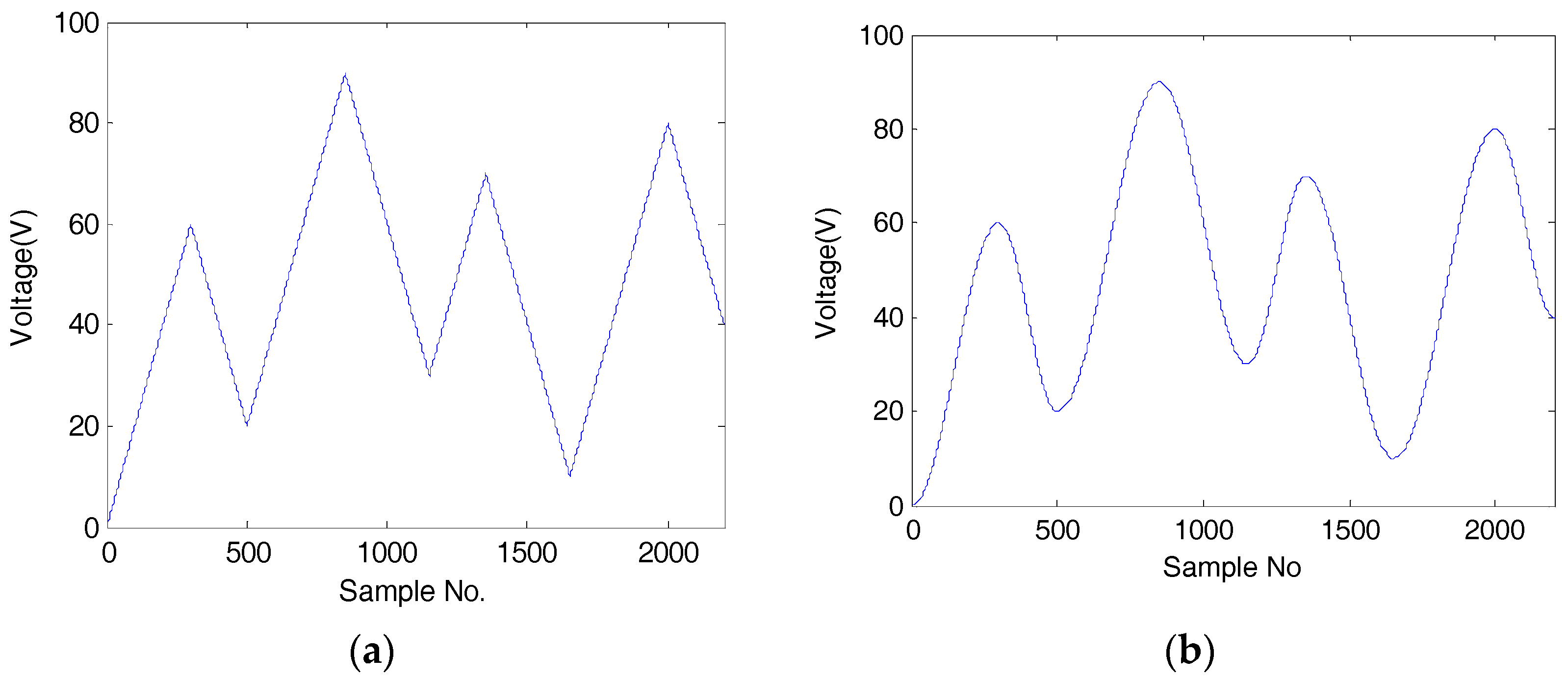 In this section, some experiments with two kinds of input waveforms (Figure 17) at different rates are undertaken to prove the effectiveness of the proposed model. For comparison, the input excitations are also applied to the numerical Preisach model that is based on first reversal curves and is built according to Equation (26) [9].