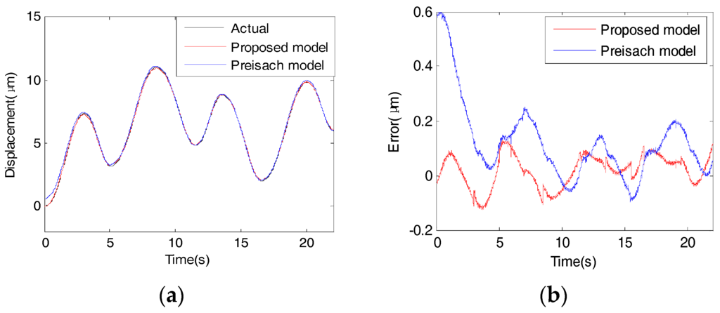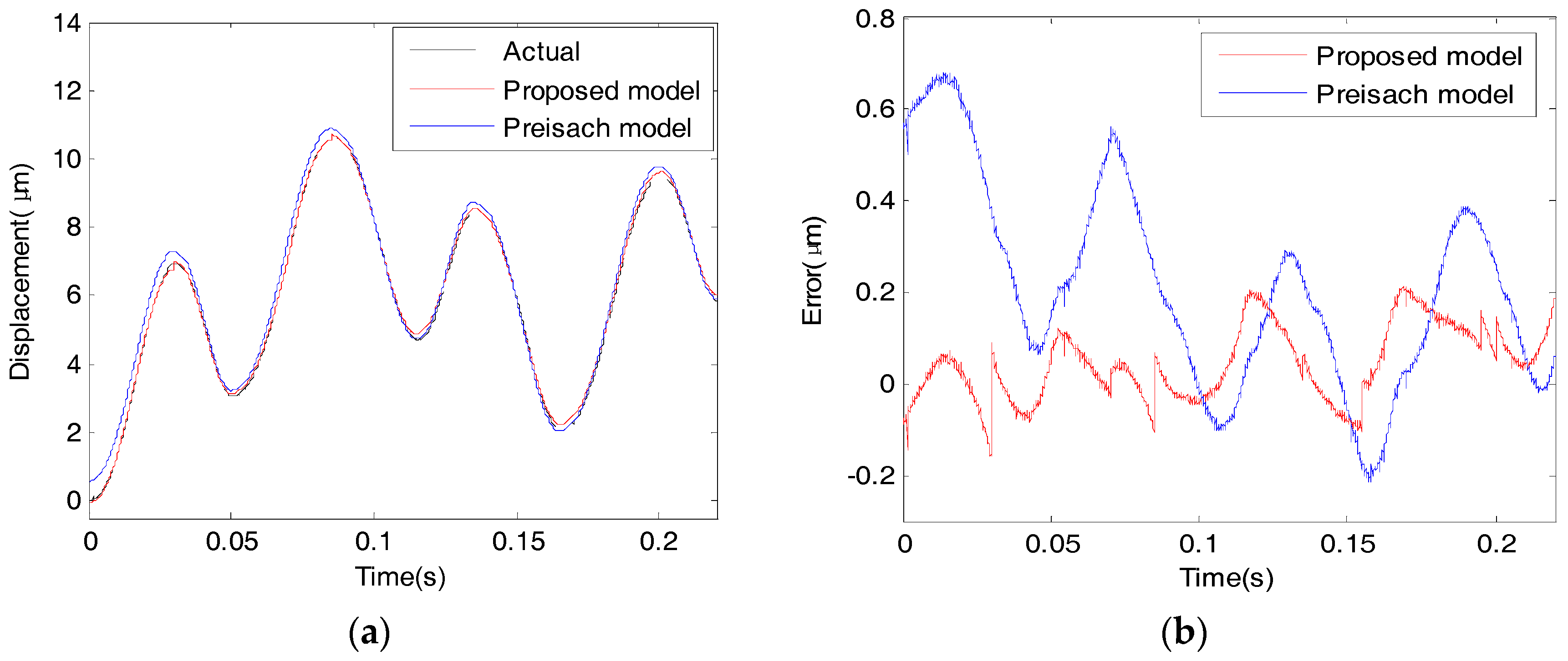 Figure 20 and Figure 21 show the modeling performances of the proposed model and the Preisach model under the sinusoidal input excitation (Figure 17b) at low rate and high rate, respectively. Table 7 gives the specific data of MAE and RMSE. When applying sinusoidal input excitation with low rate, the proposed model produce a MAE of 0.0532 μm and a RMSE of 0.0615 μm, i.e., 0.4716% and 0.5546% of the motion range, respectively. While using the Preisach model, the MAE and RMSE are 0.1352 μm and 0.1896 μm, i.e., 1.2191% and 1.171% of the overall motion range, respectively. When applying sinusoidal signals with a high rate, the MAE and MSE of the proposed model are 0.0727 μm and 0.0911 μm, i.e., 0.6946% and 0.8704% of the overall motion range, respectively. The Preisach model produces a MAE of 0.2445 μm and a RMSE of 0.3087 μm, i.e., 2.3360% and 2.9494% of the motion range.