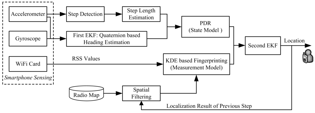 Even though a lot of work [15,16,17,18,19,20,21,22] has been done in fusing both systems, some critical problems still need to be addressed to enhance accuracy and feasibility. On the one hand, previous data fusion approaches mainly focus on deploying a particle filter [18,19,20,21], which is computationally expensive and should be run on a server. However, rather than in a server, the localization system runs on a smartphone and is preferred due to its ability to protect the user’s privacy. Furthermore, the server based approaches involve a time consuming communication process, which is unsuitable for real time applications. On the other hand, light computation algorithms including Kalman filter and its variants cannot be directly deployed, since an explicit measurement equation and related noise statistics are not available. Therefore, it is a crucial task for real time indoor localization to develop a light computation fusion system run on resource-limited smartphones. In this paper, a novel data fusion framework based on extended Kalman filter (EKF) is firstly designed and implemented. In order to make EKF applicable, we develop a measurement model using kernel density estimation (KDE), which accurately characterizes the RSS-location relationship and adaptively measures the related noise statistics. For the PDR system, we accomplish another EKF for user heading estimation by fusing gyroscopes and accelerometers. In order to avoid singularity problems and reduce computation cost, we describe the device orientation by quaternions rather than Euler angles and direction cosine matrix (DCM). Experiments in a realistic indoor environment show that, the proposed EKF based fusion approach achieves significant accuracy improvement with respect to the individual approaches. Compared with a particle filter, the proposed EKF based fusion approach obtains comparable accuracy performance, while it reduces computation cost greatly.