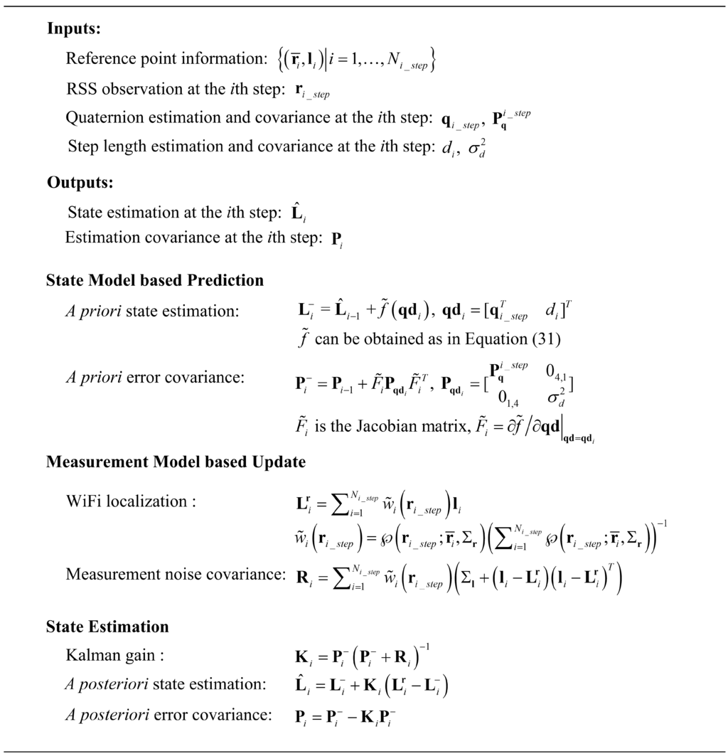 The most widely used fusion approach is a particle filter, which incurs substantial computation cost. It is unsuitable for real time indoor localization on resource-limited smartphones. Moreover, Kalman filter and its variants cannot be directly used since an explicit measurement equation and RSS noise statistics are unavailable. To make the proposed light computation EKF based approach applicable, Section 3.2 proposes a measurement model based on KDE. This section describes the detailed process of the proposed fusion approach. The complete summary of the second EKF is shown in Figure 3.