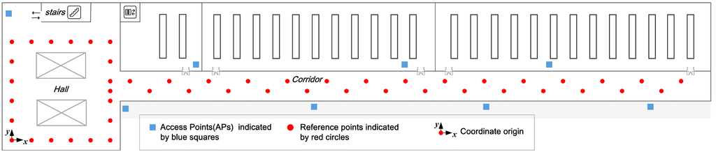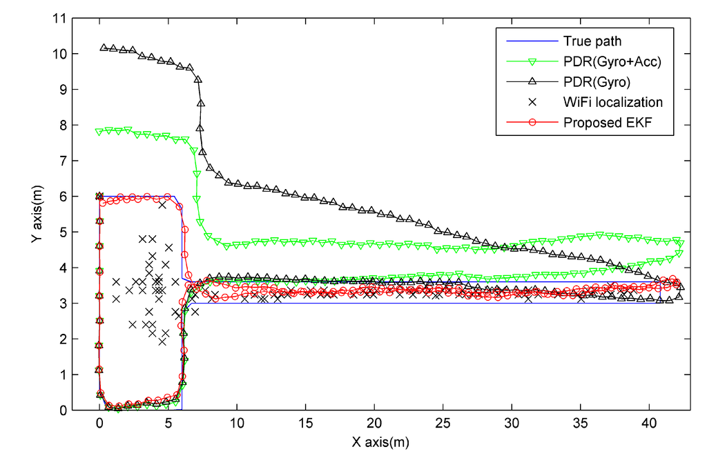 Experiments were carried out in a 43.5 m × 11.2 m indoor office area, part of the second floor of our department, as seen in Figure 4. The ground is laid with square floor tiles, whose sizes are 0.6 m × 0.6 m. We deploy a Huawei Mate smartphone running the Android 4.1 operation system as the experimental device. For the WiFi localization system, there are total 8 APs (indicated by blue squares) available and 50 reference points (indicated by red circles) deployed. The distance between neighbor reference points in the hall and corridor are 1.2 m and 1.34 m, which is the length and diagonal distance of two floor tiles, respectively. During offline phase, we collected 100 RSS training samples per reference point to build the radio map. During online phase, the user collected real time RSS vectors at about 2 Hz sampling rate. We define the reference point in the lower-left corner as the coordinate origin; the x-axis points to the right, being parallel to the corridor, and the y-axis points upward. The proposed fusion approach is compared with individual approaches of WiFi localization and PDR, the particle filter [19] using 1000 particles. To test the effectiveness of the proposed KDE based WiFi localization, we develop and test an improved particle filter (PF). Compared with the particle filter in [19], the only difference of the improved one is the particle weight update scheme, which is achieved by computing the Gaussian kernel function between the location of particles and WiFi localization results. As shown in Equations (26) and (27), the WiFi localization results are obtained by deploying KDE, while the kernel width of the Gaussian kernel function is adaptively adjusted by the related covariance. For the PDR system, we use the gyroscope module and accelerometer module built in the Huawei Mate smartphone to track the user. The gyroscope and accelerometer sensing rates are set to 100 Hz and 50 Hz, respectively. To make the gyroscope output more precise and robust, we do the necessary calibration process before carrying out experiments. Note that we only consider the common hand-held situation, and assume that the misalignment angle between the device forward and user heading is zero. The other situations, such as when the smartphone is put in a pocket or a bag, will be considered in our future works. As in much of the literature [11,16], we assume that the user’s initial location and orientation is known as a priori. To label the ground truth, we place some tags on the ground and apply a camera to record the entire walking process. Then, we manually label the coordinates of each step carefully. The localization error is calculated as the Euclidean distance between the estimated coordinates per step and the labeled coordinates per step along the true path.