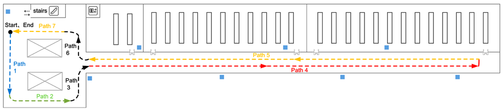 First, since the tracking performance is greatly affected by the heading estimation bias, we evaluate the heading estimation performance of the developed PDR system. Figure 5 shows the true path of the user. According to the different user heading, the whole path is divided into seven sub-paths. Figure 6 compares the heading estimation performance between approaches using gyroscope only (Gyro) and combining gyroscope with accelerometer (Gyro + Acc). One can clearly see that the estimated user headings of both approaches are close to the ground truth. Particularly, from path 1 to path 4, both approaches have approximate estimated user heading. However, from path 5 to path 7, the Gyro + Acc approach obtains better heading estimation performance than Gyro approach. The Gyro approach assumes the initial inclination angle of the hand-held smartphone is known and remains stable along the walking path. This assumption may be corrupted temporarily when drastic body swinging happens. In contrast, the EKF based Gyro + Acc approach may fuse the acceleration information well, which contains real time tilt angle information, and thus may decrease the negative effect caused by drastic body swinging.