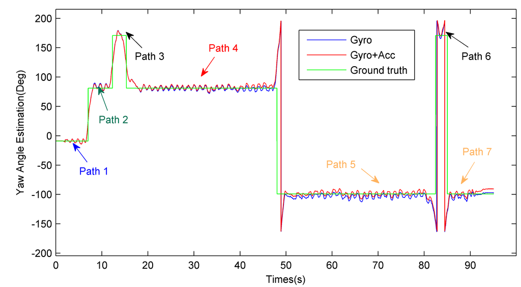 Yaw angle estimation performance comparison between approaches using gyroscope only and combining gyroscope with accelerometer.