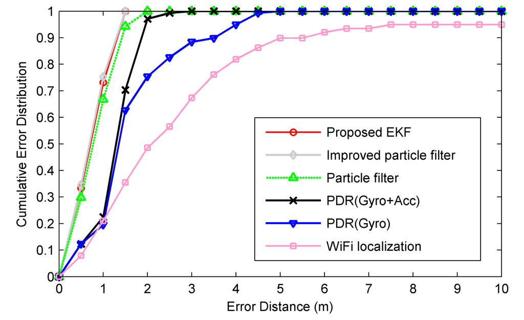 Thirdly, we compare the localization accuracy between various approaches. As seen in Table 1, compared with PDR (Gyro), PDR (Gyro + Acc), WiFi localization and the particle filter, the proposed EKF reduces mean localization errors by 54.5% (0.85 m), 42.7% (0.53 m), 74.9% (2.12 m), and 12.3% (0.10 m), while it reduces standard deviations by 65.4% (0.70 m), 30.2% (0.16 m), 86.7% (2.42 m), and 7.5% (0.03 m), respectively. Compared with the improved particle filter, little performance degradation is achieved by the proposed EKF. The corresponding cumulative error distributions are shown in Figure 8. Clearly, the proposed EKF performs much better than the individual approaches, while it achieves comparable accuracy with that of the two particle filter based approaches. Particularly, the particle filter performs a little worse than both the improved particle filter and the proposed EKF, since its particle weight update scheme may incur the adverse effect caused by some RSS observations with severe fluctuations. In contrast, the improved particle filter and the proposed EKF may mitigate the adverse effect by giving a smaller weight to the noisy RSS observation, which renders a larger WiFi localization error covariance. The related error covariance may be adaptively estimated by deploying KDE during particle weight update or EKF filtering process.