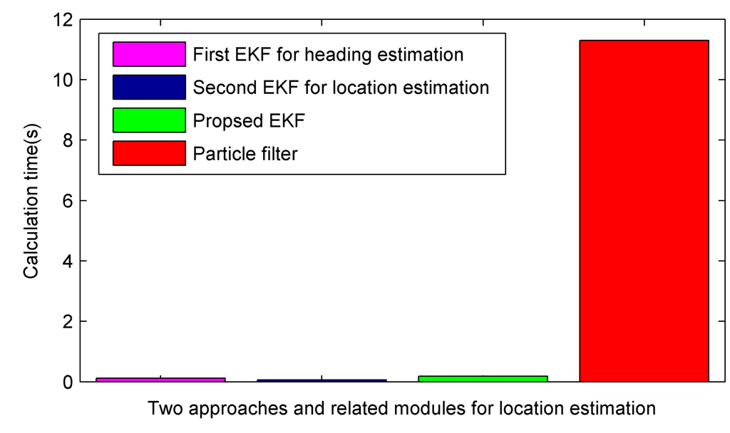 Finally, we compare the calculation time of the location estimation per step between a particle filter and the proposed EKF, as shown in Figure 9. The calculation time is obtained by running the compared approaches in Matlab and averaging calculation time per step of ten traces along the true path. The calculation time required by the proposed EKF takes 0.185 s. It is mainly caused by two modules: first EKF for heading estimation takes 0.119 s; and second EKF for location estimation takes 0.064 s. The calculation time for step detection and step length estimation only takes 0.002 s. For a particle filter with 1000 particles, it takes 11.3 s and thus is unsuitable for real time applications. The proposed EKF based fusion approach greatly reduces calculation time in comparison to the particle filter in two ways. First, except for computing Jacobian matrix, EKF requires the same computation cost as that of a Kalman filter, while the particle filter needs to calculate and update the states of a great number of particles whenever implementing a new location estimation. Secondly, the computation cost for measurement update is reduced significantly by a spatial filtering process, which reduces the number of reference points involved in Equations (36) and (37). In summary, the proposed approach achieves comparable accuracy performance to that of a particle filter, while maintaining a low computation cost comparable to that of a Kalman filter. It is more suitable than the particle filter for real time indoor localization on resource-limited smartphones.