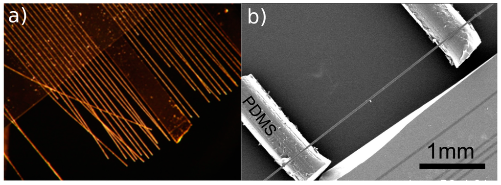 (a) Observation by optical microscope of micronic waveguiding structures after cleaving the wafer. Here, the lack of the final baking step prevents a strong adhesion between waveguide and SiO2/Si wafer. As a result, the structures are not cleaved together with the wafer. (b) SEM image of a ridge waveguide, 10 µm wide, positioned by hand on two polydimethylsiloxane (PDMS) plots.