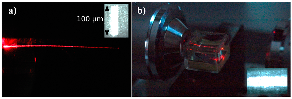 Figure 2 presents optical microscope images during laser light injection in waveguiding structures positioned on two plots of PDMS in air (Figure 2a), and also immerged in silicon oil with a refractive index of 1.40 at 670 nm (Figure 2b). The PDMS has been chosen to minimize contact areas and for its refractive index (n = 1.41 at 670 mn []) that is compatible with optical confinement in SU8. Whatever the dimension of the waveguides, light propagation is effective and leads to a transmitted signal that is highlighted in the insets of Figure 2a,b, where light appears confined in the SU8 structure, both for air- and oil-surrounding media. From Figure 2a, optical losses can be estimated by the exponential decrease of the scattered light along the waveguide. A value of about 20 dB/cm is evaluated.