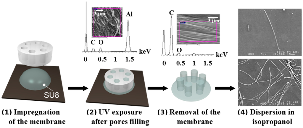 The wetting template method is based on the impregnation of a commercially available 60-μm thick alumina porous membrane (anodized aluminum oxide, AAO) with the SU8 photoresist, as described in Figure 3. After diffusion and evaporation of the solvent, the reticulation of the SU8 is performed under a UV lamp at λ = 365 nm. Then, the selective dissolution of the membrane takes place in a bath of either H3PO4 or NaOH during 12 h. Finally, the sample is rinsed in deionized water. The dispersion of the nanostructures is performed in an appropriate solvent with low surface tension, such as isopropanol (γ = 21.8 N/m). This is a key-step for the integration of NTs (nanotubes) as individual building-blocks in order to study their wave-guiding properties and to further design optical devices.