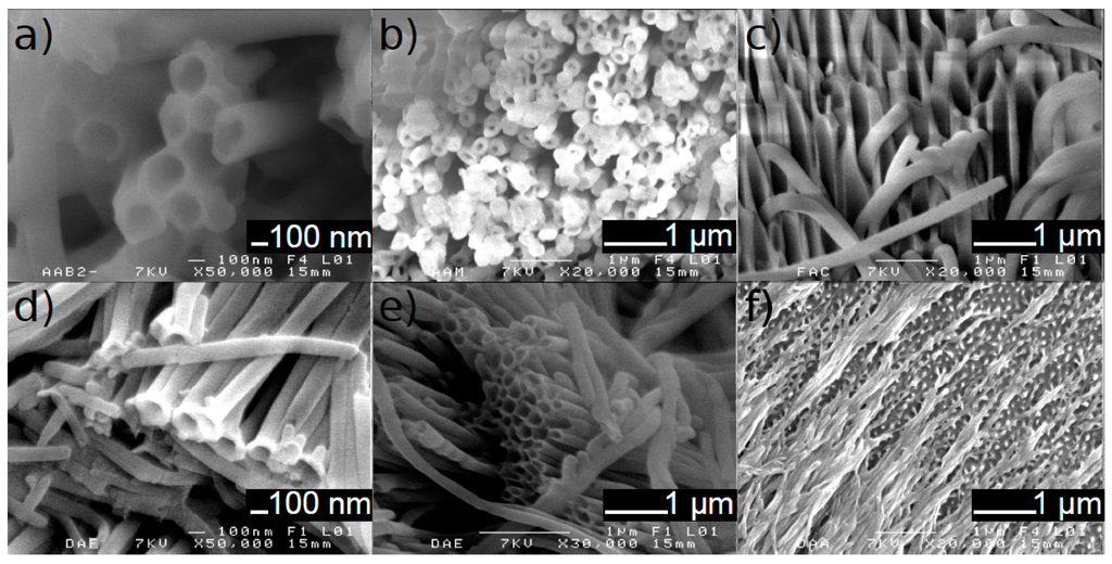 The impregnation of the nanopores of the membrane is based on the surface tension difference between the membrane and the SU8 solvent, which ensures the wetting of the membrane. By modification of the SU8 viscosity, the solvent surface tension is also modified enabling the variation of the film thickness deposited along the nanopores walls. Impregnation of AAO membrane (reference Whatman supplied by Fisher Scientific) with nanopores diameter of 240 nm for different SU8 viscosities were performed. Figure 4a–c displays the SEM images of the obtained nanostructures for respective SU8 viscosities of 7.7 cSt (SU8-2002), 380 cSt (SU8-2010), and 4500 cSt (SU8-2025). For the lowest viscosity, nanotubes of an internal diameter of 120 nm are observed, while for the largest viscosity, nanowires are formed. It is emphasized that the good mechanical strength of the photoconverted SU8 allows the fabrication of very long and quite rigid nanostructures with a regular and cylindrical aspect along their length. The effect of the pore diameter for a fixed viscosity (7.7 cSt, SU8-2002) has been determined by wetting AAO membranes with various nanopores of diameters (supplied by Synkera Technologies). Results displayed in Figure 4d–f show that the nanotubes wall decreases when the nanopores diameter decreases. In the extreme case of 55 nm nanopores diameter (Figure 4f), the nanotubes walls are too thin to enable a good mechanical strength, preventing the use of such nanotubes as building blocks.