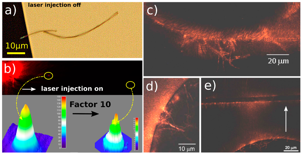 Another coupling method developed in our group is based on the high evanescent field inherently surrounding sub-micronic structures. It has been exploited for coupling two waveguiding structures or for excitation of fluorescent labels []. Figure 5a,b present light injection and propagation along two SU8 nanotubes of 240 nm and 120 nm external and internal diameters respectively: light is injected from a microlensed fiber into the nanotube located on the edge of the wafer, at the left side of the optical microscope image. Once aligned, and under light injection (λ = 675 nm), a spot at the output facet of both nanotube attests the effective injection, propagation, and coupling between the two adjacent nanotubes. These spots are highlighted on Figure 5b by the two circles. By imaging in 3D these propagative spot, it is shown that the intensity is decreased by a factor of ten. This decrease is attributed to the evanescent coupling and to the propagation losses along the longer nanotube.
