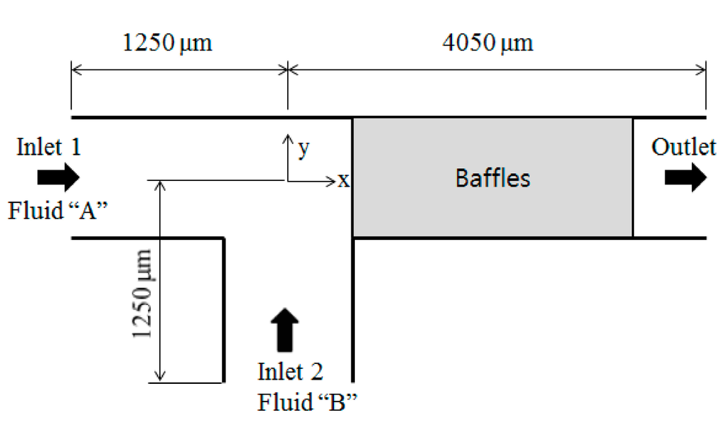 For the sake of simplicity, we assumed the same aqueous solution flows into the two inlets. The fluid was assumed to have the properties found in many existing BioMEMS systems. Its diffusion constant is equal to D = 10−10 m2/s and the kinematic viscosity of fluid is ν = 10−6 m2/s at room temperature. This value of the diffusion constant is typical of small proteins in an aqueous solution. Thus, the Schmidt (Sc) number defined as the ratio of the kinetic viscosity and the mass diffusion of fluid is 104.