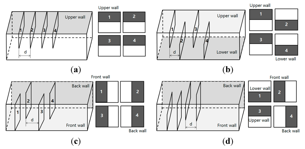 Schematic diagrams of four different configurations of repeated baffles. (a) Upper wall attachment. (b) Opposite wall attachment: type 1. (c) Opposite wall attachment: type 2. (d) Cyclic attachment.