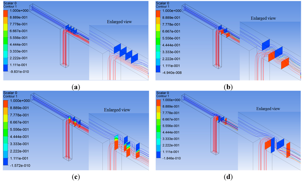 To understand how the baffle size affects the mixing of two fluids, A and B, the mass fraction distributions obtained with three different baffle sizes and two baffle intervals are depicted in Figure 13. The cross section is located 50 μm downstream of the eighth baffle. Figure 13a–c shows how the boundary between fluids A and B changes as the baffle clearance gap is optimized. Figure 13d is the mass fraction distribution of the baffle configuration optimized in terms of the baffle interval as well as the clearance gap. The boundary between fluids A and B is the longest curve, and it is a result of the flow rotation in the y-z plane as the flow passes through the baffles. Figure 14 shows how the baffle size and interval affects the DOM evolution in the outlet branch. All four cases correspond to a similar pressure load between the inlet and outlet sections. For c = 0 μm and d = 100 μm, twelve baffles were used and the pressure load was 21.70 Pa. For c = 15 μm and d = 100 μm, 21 baffles were used and the pressure load was 21.59 Pa. Twenty baffles were used for c = 15 μm and d = 75 μm, and the corresponding pressure load was 21.64 Pa. The DOM within the region of the baffles is affected by both the baffle clearance gap and the baffle interval, while the DOM evolution rate after the region of the baffle is mainly affected by the baffle clearance gap. The configuration made of 20 baffles with c = 15 μm and d = 75 μm shows the best DOM, and it suggests that we can find an optimum baffle configuration for a given pressure load.