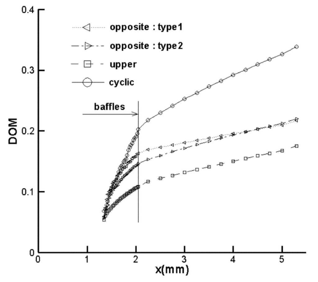 Four baffle configurations (upper, opposite (type1), opposite (type2), and cyclic) were designed and simulated in order to study the effects of configuration on the mixing performance of the microchannel. A cyclic baffle configuration means that four baffles are attached to the four sides of the microchannel wall in a cyclic order. A comparison of the DOM distributions for four different baffle configurations shows that the baffle configuration is an important design parameter. When a cyclic configuration is used, the DOM at the outlet shows the best result with a value greater than twice that of the DOM for a corresponding upper wall configuration.