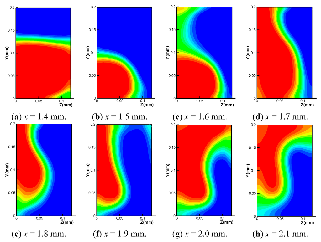 The DOM evolutions along the outlet branch for four configurations are plotted in Figure 7. The figure shows that the mixing enhancement of the cyclic attachment is achieved in two different ways. One enhancement occurs in the baffle region. The cyclic attachment shows a DOM improvement of about 87%, just after the baffle region, compared to that of the upper wall arrangement of baffles. This improvement appears to be due to the rotation and twist of the flow in the cross section of the channel, as shown in Figure 5 and Figure 6. Figure 8 shows how the mass fraction distribution of fluid B changes as the flow passes through the eight baffles. For example, Figure 8a depicts the mass fraction distribution in the mid plane between the first and second baffles. In the same way, Figure 8g shows the result obtained in the mid plane between the seventh and eighth baffles, and Figure 8h is in the plane of 50 μm downstream of the eighth baffle. Fluid B (shown in red in the figures) is seen to rotate by more than 90° in the clockwise direction. This flow rotation was not observed in the other configurations. As a result, the boundary between fluids A and B became more blurred and curved as the fluid flow passed through the baffles. The other improvement occurs in the remaining section of the outlet branch. As shown in Figure 7, the slope of the cyclic attachment is about twice as steep as the other slopes. The mixing in this region is due entirely to the molecular diffusion. Therefore, the shape and length of the boundary between fluids A and B seem to determine the DOM evolution rate in this region. The cyclic configuration exhibits the longest and most curved boundary as shown in Figure 5.