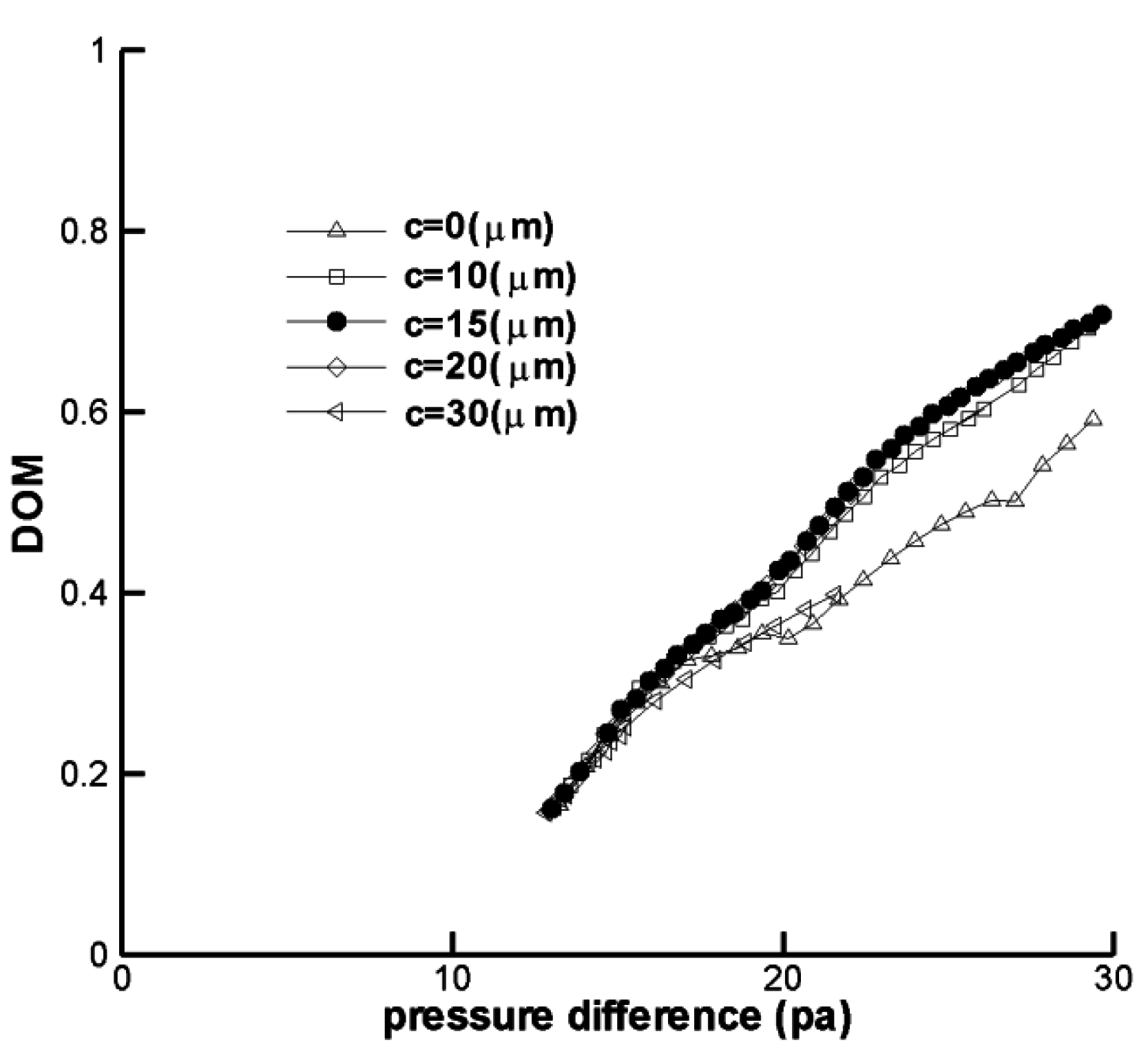 Figure 11 shows the DOM distribution as a function of the pressure difference for five different clearance gaps. The clearance gap c is seen to be optimized in terms of the DOM. The optimal value is about 15 μm. This optimization can be explained as follows. As the clearance gap c increases, the baffles become smaller and some additional baffles might be used for a given pressure load. More baffles may lead to an increase in the DOM. However, smaller baffles may not properly block the flow and do not promote mixing in the baffle region. Thus, we can expect that there is an optimal value of the clearance gap c for a given pressure load.