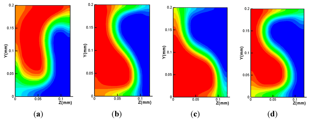The two inlets were assumed to have a uniform velocity profile of 1 mm/s. The outflow condition is used at the outlet. Thus, the fluid flow in the microchannel corresponds to a Reynolds number of 0.3. All of the other walls were treated as no-slip walls. The mass fraction of the fluid at inlet 1 is set to ϕ = 0, and the fluid entering through inlet 1 is called fluid A. The fluid at inlet 2 has a mass fraction of ϕ = 1 and is called fluid B. Thus, c was defined as the mass fraction of the fluid B.