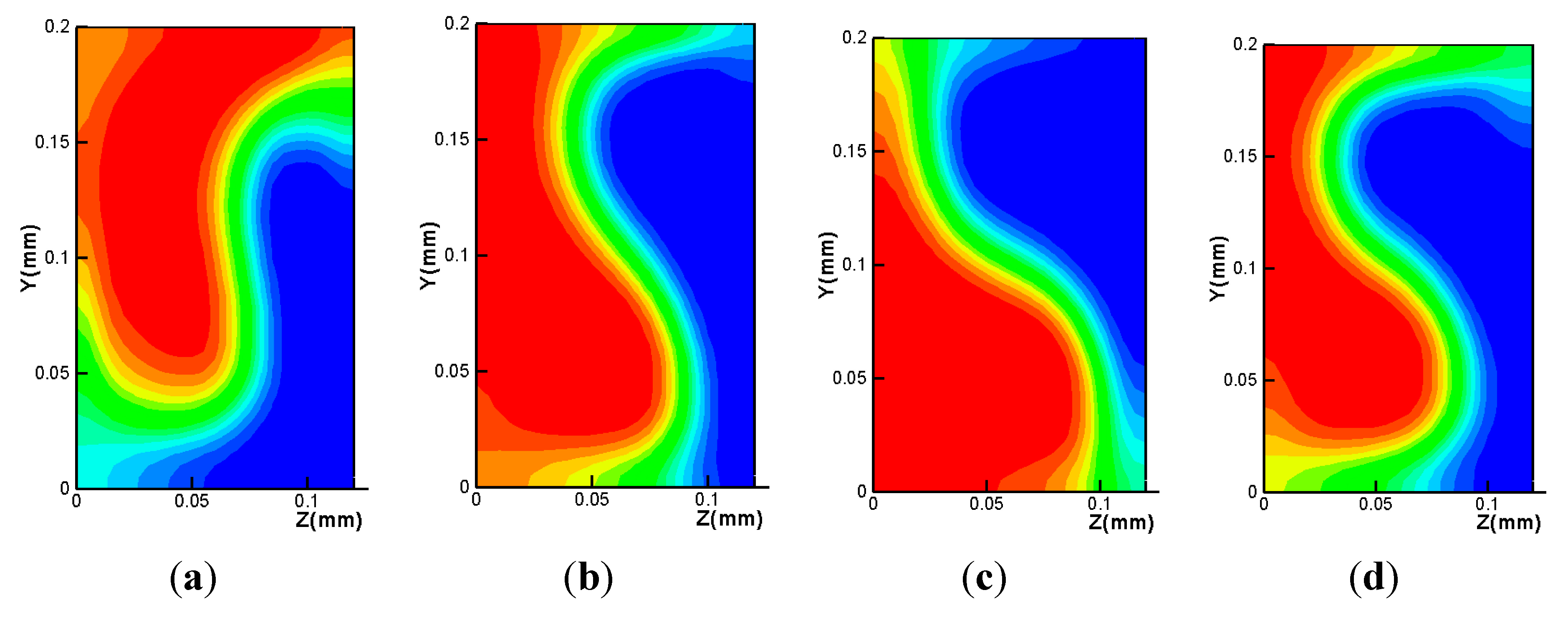 Comparison of the mass fraction distribution in the cross section at 50 μm downstream of baffles for four different baffle clearances and intervals. (a) c = 0 μm and d = 100 μm. (b) c = 15 μm and d = 100 μm. (c) c = 25 μm and d = 100 μm. (d) c = 15 μm and d = 75 μm.