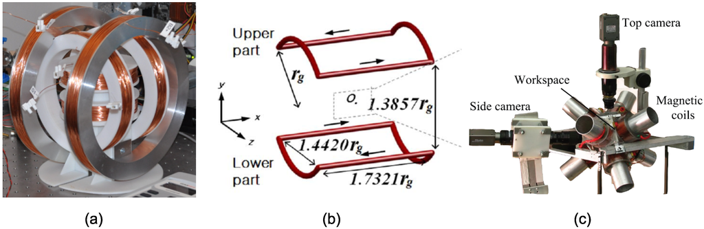 Figure 1. Electromagnetic systems: (a) 3D Helmholtz coils [52]; (b) gradient saddle-shaped coils (©2015 IEEE; reprinted, with permission from [53]); (c) electromagnetic system with eight electromagnets (©2015 Wiley; reprinted, with permission from [54]).