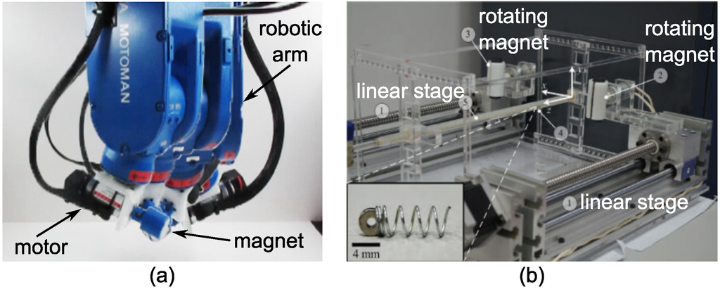 Figure 2. Rotating permanent magnetic systems: (a) a rotating permanent magnet mounted on a robotic arm (©2015 IEEE; reprinted, with permission from [70]); (b) two synchronized rotating permanent magnets mounted on two linear stages (©2015 IEEE; reprinted, with permission from [72]).