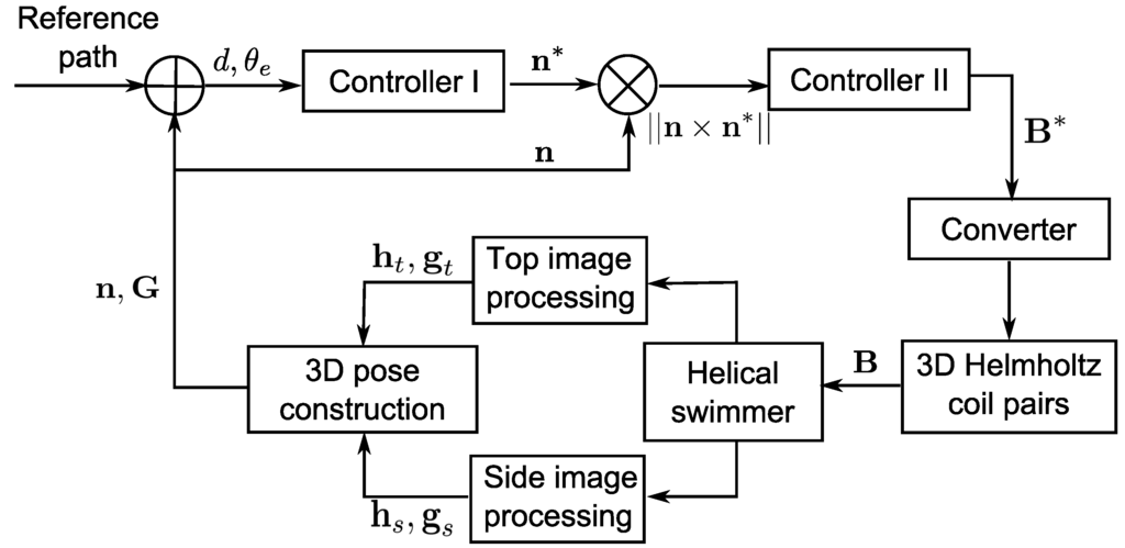 Figure 6. Block-diagram of the control of a non-holonomic helical swimmer for planar path following. Controller I: linearization of the state-space model of the helical swimmer for path following with chained forms. Controller II: P controller for 3D steering. Notations: d is the lateral error between the helical swimmer and the path; θ e is the angle error between the orientation of the swimmer and the tangent of the path; n and n* are respectively the real-time and the target orientation of the helical swimmer in the 3D space; h t and h s are respectively the tracked axis of the swimmer in the top and side camera image; g t and g s are respectively the tracked barycenter of the swimmer in the top and side camera image; G is the calculated barycenter of the swimmer in the 3D space.