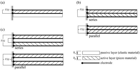 A summary of the commonly used configurations of piezoelectric bending actuators is shown in Figure 1. It is assumed that actuators are made up of homogenous layers of active (piezoelectric) material or passive (elastic) material. The simplest viable configuration is comprised of one active layer and one passive layer and is referred to as a unimorph [20], Figure 1a. For configurations with two active layers, the general arrangement is one in which the two active layers are separated by an inner passive layer [21], Figure 1c. For the purposes of the present work, we will refer to this as a triple layer bimorph. In the limit when the thickness of the inner passive layer is reduced to zero, we reach the configuration shown in Figure 1b, which we will refer to as a double layer bimorph. Note that for both types of bimorphs shown, the active layers may be connected in series or parallel depending on the poling direction of the piezoelectric material.