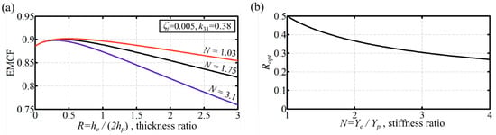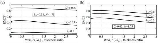 Note that for verification, Equation (21) returns to the double layer bimorph expression (Equation (20)) for the case R = 0, as required. Again, the higher the k31 value the higher the dynamic EMCF, and the lower the ζ1 value the higher the dynamic EMCF; however, the k2 value now depends on the layers’ thickness ratio, R, and the Young’s modulus ratio of the layers, N. Inspection of Equation (21) shows that the lower N values lead to higher k2 values; that is, an elastic material with lower Young’s modulus is favorable from a coupling point of view.
