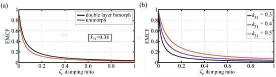 Double layer bimorph dynamic EMCF. (a) effect of damping ratio; k31 = 0.38. The EMCF of an optimum thickness unimorph with steel passive layer is shown for reference. Practically, this unimorph configuration can achieve the best EMCF values; thus, the superiority of double layer bimorphs against unimorphs is demonstrated; (b) effect of the PZT layer transverse electromechanical coupling coefficient for double layer bimorphs.