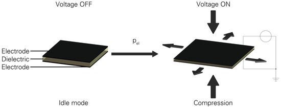The initiative taken by governments to reduce emissions of CO2 during the production process and for the whole lifetime of products increases the interest in new and unconventional solutions. Therefore, industrial companies are finding ways to reduce pollution emissions and save valuable energy. Dielectric elastomer actuators (DEA) represent a promising field of research. The first investigated DEA was published by Röntgen at 1880 and since 1992 DEAs have been back in the focus of researchers and industrial operators as part of further investigations [1,2,3,4]. DEAs are not only applicable as actuators but also as sensors or energy harvesters [5,6,7,8,9,10,11,12,13,14]. DEAs consist at least of three layers, whereby a flexible dielectric is covered on both sides with compliant electrodes [3]. The operating principle of a DEA is based on the electrostatic pressure pel = ε0·εr·U2·z−2, which causes the displacement of the actuator sz = −ε0·εr·U2·Y−1·z−2 [3,4]. The specific values of the past equations are the relative dielectric coefficient εr, thickness of the dielectric z, elastic modulus Y of the dielectric layer, permittivity of vacuum ε0 and driving voltage U. Figure 1 visualise the operating principle of DEAs.