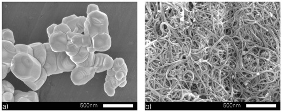 The modification of the basic raw polymer depends on the type of filler, morphology and kind of agglomeration. Figure 2 visualises the (a) PMN-PT; and (b) SWCNTs, which were used for the modification of the PDMS, and shows the differences regarding their morphology and agglomeration. The PMN-PT is nearly spherical, does not build strong agglomerates and needs only a homogenisation. Therefore, the integration was done by using a dual asymmetric centrifuge, produced by Hauschild Engineering & Co. KG (Hamm, Germany). The SWCNTs are tube-like with a high aspect ratio, build strong agglomerates induced by their reactivity and need a deagglomeration and homogenisation. This was realised by a multistage process. At first, a homogenous premix was built by using the dual asymmetric centrifuge. Subsequently, the deagglomeration and homogenisation was done by a stepwise processing at a three roll mill, produced by EXAKT Advanced Technologies GmbH (Norderstedt, Germany) [33,34,35,36].