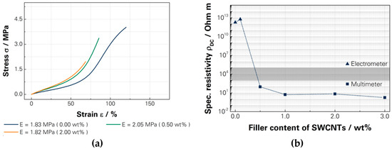 The modification of the basic raw polymer with SWCNTs had an influence on the mechanical values, which was negligible. The elastic modulus fluctuates in the range between 1.82 MPa and 2.05 MPa. The stress was reduced from 4.0 MPa to 1.96 MPa and the strain from 120% to 70% by the addition of 2.0 wt % of SWCNTs. Additionally, a counteracting effect should be possible through the adjustment of the basic raw polymer. Figure 5a shows the influence of the mechanical values.
