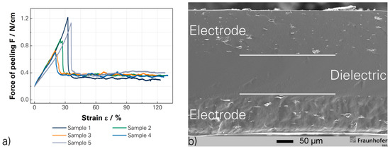 The investigated production technology for the full polymer DEAs was construed as variable and scalable process. The investigated production technology satisfied a high variability of electrode geometries up to thin elastic conductive paths for the electrical connection of the DEAs, which is only restricted by the mask and structuring technology. The produced DEAs exhibit a high reproducibility with variations below 5% regarding to the layer thickness and mechanical properties. Additionally, such DEAs achieved an outstanding stability of the different interconnected layers, which was proven by peel tests and SEM images. The peeling is the worst kind of exposure to the interconnection and peeling forces of 0.4 N/cm were achieved. Additionally, the SEM image of cryogenic-fractured DEAs does not show any trapped air, kissing bonds or some other failures of the interconnection. Therefore, an outstanding durability of the DEAs was achieved and malfunctions caused by the production process and layer interconnection are unexpected. Figure 6a shows the peeling test and (b) a SEM image of a cryogenic-fractured three layer DEA. Figure 6b visualises also a slight re-agglomeration of the SWCNTs along the fracture. The reactivity of the SWCNTs caused the re-agglomeration, which is positive for the electrical conductivity [60,61]. These sub-agglomerates build interconnections between the SWCNTs and reduce the percolation threshold [60,61]. Figure S9 shows three kinds of produced DEAs.