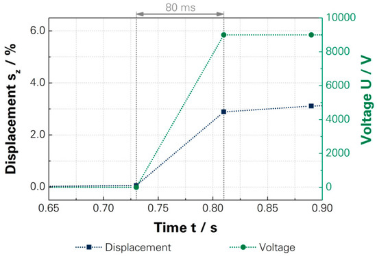 At first, the reaction time for the standard actuator was investigated for a driving voltage of 9000 V and reached 80 ms, shown at Figure 7. The investigation was limited by the equipment and a further reduction should be possible. Additionally, Figure 7 shows that the main part of the displacement was reached directly after turning on even though a further displacement takes place during the subsequent period. This can be explained through the Mullins effect, whereby the elasticity of the polymer depends on the duration and count of cycles of the acting exposure [62,63,64]. Therefore, the actuation displacement achieved for the short time exposure can differ from a static exposure. The evaluation of short term exposure is done based on the measured displacements regarding the driving voltage for several cycles, which is used for calculating the average displacement. The average displacement of the driving voltages was used to calculate the characteristic curve of the actuator, as presented in Figure S12.