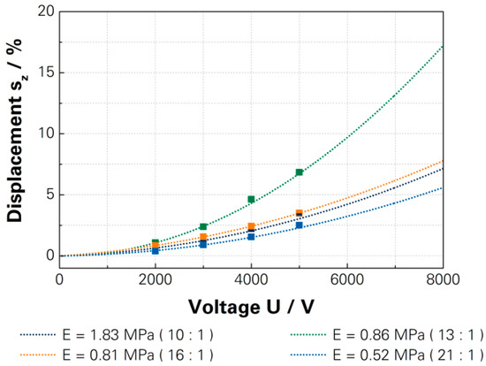 The investigation into the influence of the elastic modulus on the actuation displacement involved the examination of four values, adjusted by the variation of the curing agent ratio. The used DEAs had an elastic modulus of 1.83 MPa (10:1), 0.86 MPa (13:1), 0.81 MPa (16:1) and 0.51 MPa (21:1). The dependency of the actuation displacement was proven but the restoring forces significantly limited the increase of the displacement. The reduction of the elastic modulus to 0.81 MPa caused an increase of the displacement but a further reduction of the elastic modulus caused a decrease of the displacement. The DEA with 0.81 MPa still achieved a displacement beyond the standard actuator and the DEA with 0.51 MPa reached the lowest displacements. The DEAs achieved, with a driving voltage of 7000 V, a displacement of 5.7% (1.83 MPa), 13.3% (0.86 MPa), 5.5% (0.81 MPa) and 4.3% (0.51 MPa). Figure 8 shows the measured actuation displacements and calculated characteristic curves for comparison, and the associated investigations are detailed in Figures S13–S16.